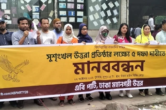 আজ বুধবার দুপুরে রাজধানীর উত্তরা হাউস বিল্ডিং মোড় এলাকায় মানববন্ধনে এ কথাগুলো বলেন এবি পার্টির ঢাকা মহানগর উত্তর শাখার নেতারা। উত্তরা নিয়ে দলটির প্রস্তাবনার মধ্যে রয়েছে—সব ধরনের চাঁদাবাজি বন্ধ করতে হবে। সরকার কর্তৃক নির্ধারিত ইজারার মাধ্যমে আন্তজেলা বাসটার্মিনাল, পাইকারি আড়ত ও দর্শনীয় স্থান নিয়ন্ত্রণ করতে হবে। যাত্রীদের হয়রানি বন্ধ করে যাত্রীসেবায় প্রতিটি বাস কাউন্টারে পরিচ্ছন্নতাকর্মী নিয়োগ দিতে হবে। প্রতিদিন নির্দিষ্ট সময়ের মধ্যে বর্জ্য নিষ্কাশন কার্যক্রম শেষ করে পরিষ্কার–পরিচ্ছন্ন উত্তরা নিশ্চিত করতে হবে। সব ধরনের সন্ত্রাসী কার্যক্রম বন্ধ করতে হবে। প্রতিটি থানায় স্পেশাল হেল্পলাইন নম্বর চালু করতে হবে। ভুক্তভোগীর ত্বরিত সহায়তা নিশ্চিত করতে হবে।