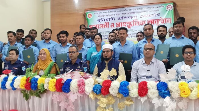 গোপালগঞ্জের মুকসুদপুর উপজেলায় ইউনিয়ন পরিষদের গ্রাম পুলিশ সদস্যদের পেশাগত দক্ষতা বৃদ্ধির লক্ষ্যে আয়োজিত মাসব্যাপী বুনিয়াদী প্রশিক্ষণ কোর্সের সমাপনী ও সাংস্কৃতিক অনুষ্ঠান অনুষ্ঠিত হয়েছে।