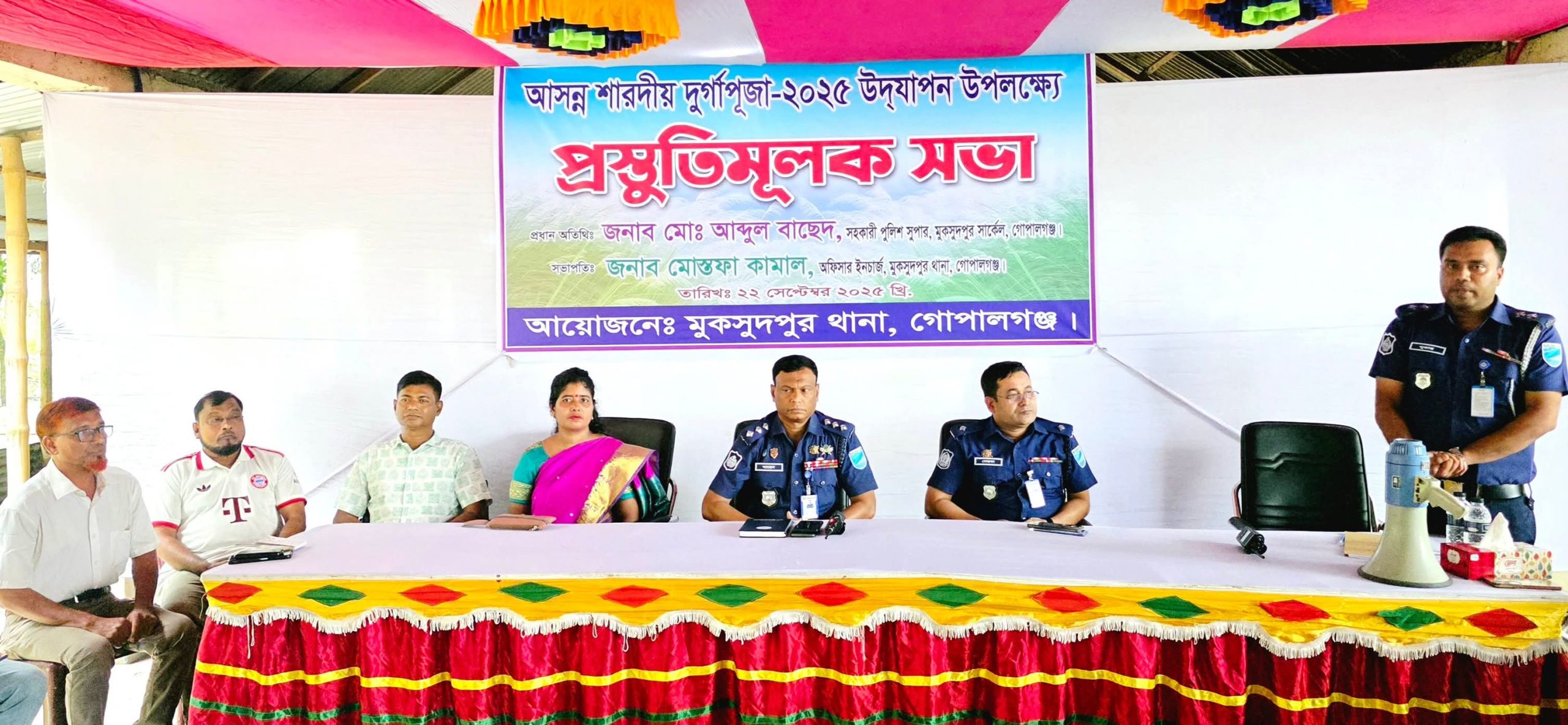 সভায় প্রধান অতিথি হিসেবে উপস্থিত ছিলেন মোঃ আব্দুল বাছেদ, সরকারি পুলিশ সুপার (মুকসুদপুর সার্কেল, গোপালগঞ্জ)। অনুষ্ঠানে সভাপতিত্ব করেন মুকসুদপুর থানার অফিসার ইনচার্জ মোস্তফা কামাল এবং সঞ্চালনা করেন থানার সেকেন্ড অফিসার সুকান্ত বাউল।