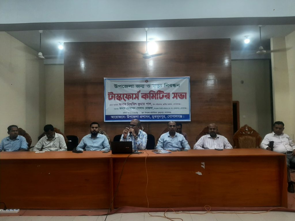 গোপালগঞ্জ জেলার মুকসুদপুর উপজেলা প্রশাসনের উদ্যোগে আজ বৃহস্পতিবার উপজেলা অডিটোরিয়ামে জন্ম ও মৃত্যু নিবন্ধন সংক্রান্ত টাস্কফোর্স কমিটির সভা অনুষ্ঠিত হয়েছে।