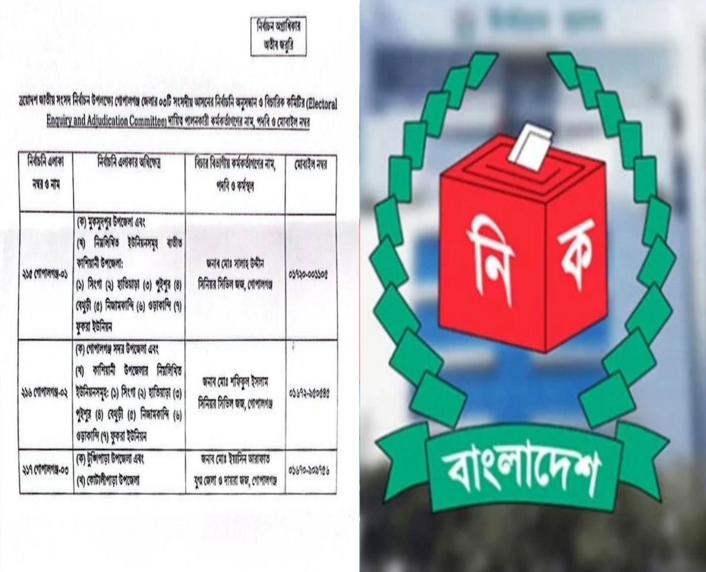 আসন্ন জাতীয় সংসদ নির্বাচনকে কেন্দ্র করে গোপালগঞ্জ জেলার তিনটি সংসদীয় আসনে নির্বাচন সংক্রান্ত অভিযোগ অনুসন্ধান ও নিষ্পত্তির লক্ষ্যে নির্বাচন অনুসন্ধান ও বিচার কমিটি (Electoral Enquiry and Adjudication Committee) গঠন করা হয়েছে।
